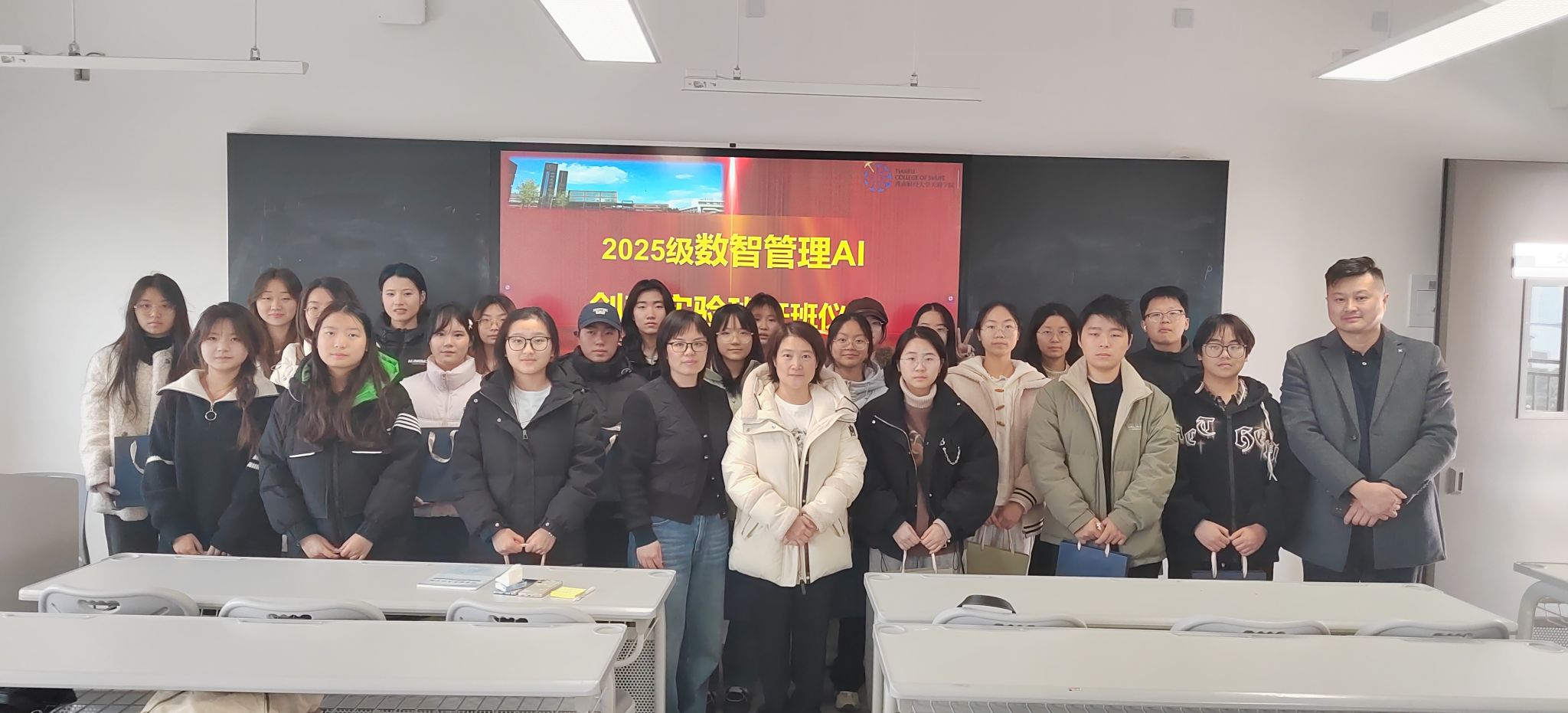 12月23日,现代管理学院举行2025级数智管理AI创新实验班开班仪式。学院副院长高丹教授、分党委副书记潘兰副教授、院长助理杜民帅副教授以及全体22名入选学生参加仪...