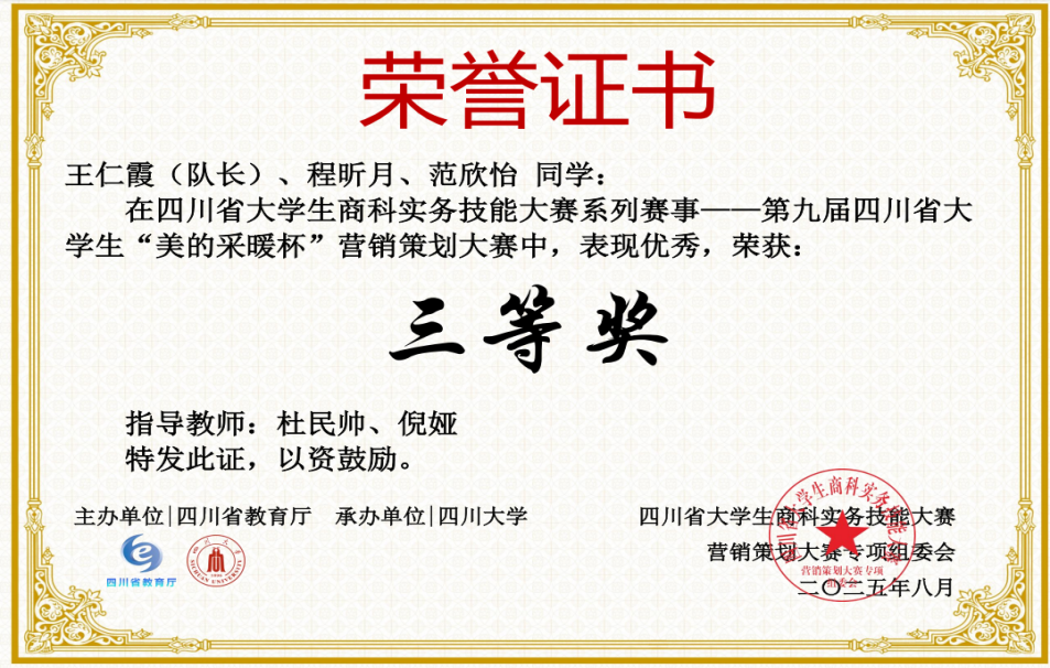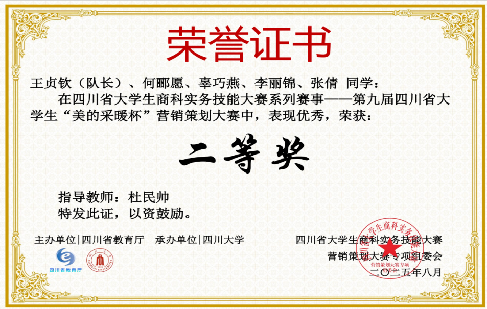 近日,由四川省教育厅主办、四川大学承办、四川大学商学院执行、美的集团股份有限公司协办的四川省大学生商科实务技能大赛(营销策划专项)圆满落幕。现代服务管理学院学子凭借扎实的专业知识、卓越的实践能力以及精心的策划方案,在众多参赛队伍中脱颖而出,共荣获四川省二等奖1项、三等奖1项。