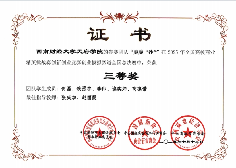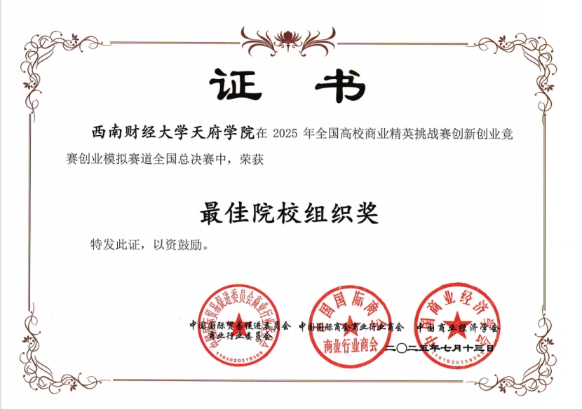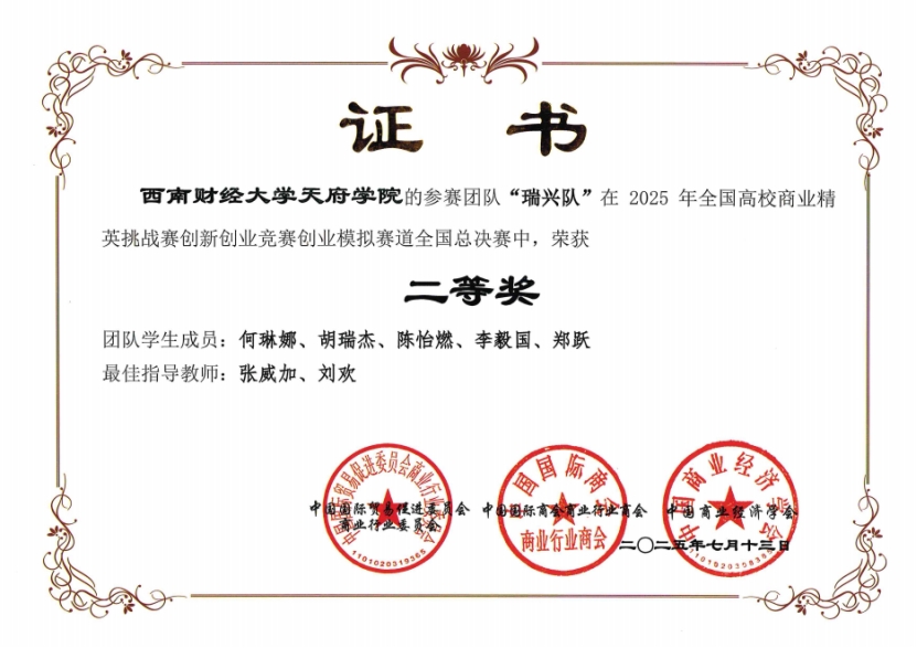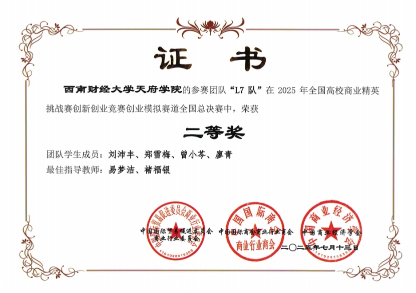 由中国国际贸易促进委员会商业行业委员会牵头,会同有关专业协会(学会)和事业单位联合主办的2025年全国高校商业精英挑战赛创新创业竞赛“精创教育杯”创业模拟赛道全国总决赛落下帷幕。全国高校商业精英挑战赛创新创业竞赛是由中国国际贸易促进委员会商业行业委员会主办的国家级学科竞赛活动。根据2023年3月由中国高等教育学会高校竞赛评估与管理体系研究工作组发布的《全国普通高校大学生竞赛分析报告》竞赛目录,全国高校商业精英挑战赛创新创业竞赛再次纳入学科竞赛排行榜,并被认定为我校二类竞赛项目。本次比赛中,西财天府学院现代管理学院5个团队凭借扎实的专业知识、卓越的实践能力,不畏困难、通力合作,经过近4个小时的激烈角逐,最终斩获国赛二等奖3项、三等奖2项,学校获得最佳院校组织奖。