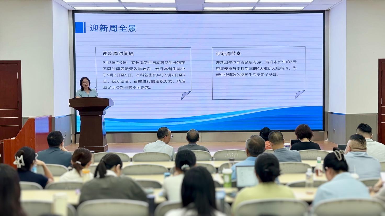 潘兰总结了迎新工作的阶段性成果,包括顺利完成新生家长会、新生入学教育、第二课堂讲解以及班委选举等重要活动。她特别提到,“家长见面会”成功地让家庭和学校从“各自为战”走向了“协同作战”,而“书记、院长第一课”则通过学院领导亲身经历诠释了大学精神,帮助新生系好了大学生活的“第一粒扣子”。