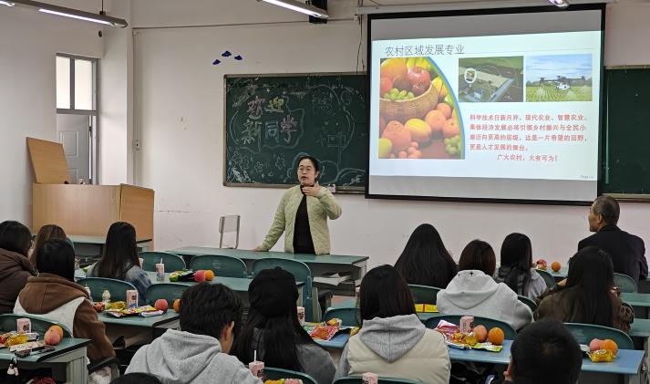 随后,贾学梅从个人成长角度出发,结合专业人才培养目标,建议同学们尽早明确发展方向,围绕考公、考研、就业等路径制定阶段性计划,并在课程学习与实践积累中精准发力。她表示,“农村区域发展专业的成员就像一家人”,温馨的话语进一步增强了学生的归属感和凝聚力。