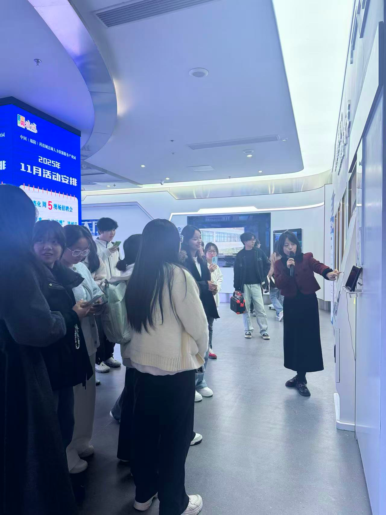 16日,师生一行前往涪城区人力资源智慧招聘大厅开展交流学习。学生们现场体验了智慧招聘的信息录入流程与人才政策查询系统,进一步理解了人力资源服务机构与企业内部人力资源管理职能的区别与联系。