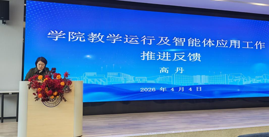 随后,学院各分管领导依次通报重点工作进展。刘宇通报学科专业与科研建设工作,2026级人才培养方案已完成专家评审,教学成果奖顺利完成申报,学院将持续攻坚省部级项目。高丹作教学运行及智能体应用工作反馈,传达学校办学定位与AI时代教育变革要求,明确课堂教学的量化标准,推动教师角色向学习设计者、引导者转型。潘兰通报学生管理工作,学院围绕心理护航、学风建设、精准资助、学业预警开展工作,已完成全体在校生心理测评复测。四月将重点开展心理健康文化活动、升学就业服务,协同教学条线保障毕业论文答辩平稳推进,筑牢学生安全与成长防线。杜民帅反馈创新班建设阶段性成果,并强调下一步将聚焦成果转化,加快智能体课堂应用,持续跟踪学情,保障创新人才高质量培养。